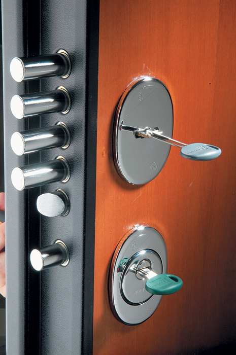 Vrata sadrže jednu od ponudjenih tri modela brava marke Mottura koja zabravljuje vrata u 10 tačaka sa 5 šipova visoke nosivosti sa strane brave i po jednim šipom sa gornje i donje strane po vertikali vrata. Pored šipova koje pomera sama brava sa strane kod šarki nalaze se 3 masivna šipa ravnomerno raspoređena i čvrsto zavarena za unutrašnjost vrata, tako da vrata u zatvorenom položaju, zajedno sa šarkama čine vezu neodvojivom. Dopunska uloga ovih šipova je i ta što sprečavaju skidanje krila sa štoka. Štok vrata je napravljen od profilisanog čeličnog lima debljine 2 mm koji je po uglovima čvrsto zavaren..